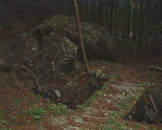![]() 天禺岩より見た台石 初めて行った時には草が茂っていて発見できなかった。 2度目の調査に行った時には、道も整備され台石の回りもきれいに草が刈られていた。 |